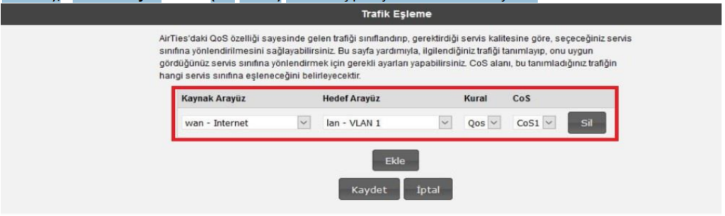 6. Sol taraftaki “QOS ” ana menüsünün altında yer alan “ Trafik Eşleme” başlıklı ekranı açınız. Açılan ayar sayfasında “Ekle” butonuna basıyoruz, bu kısım otomatik olarak açılıyor ve “Kaynak Arayüz” kısmı (wanİnternet), “Hedef Arayüz” kısmı (lan-Vlan1) olarak seçip Kaydet butonuna basıyoruz.