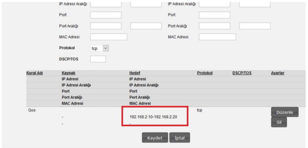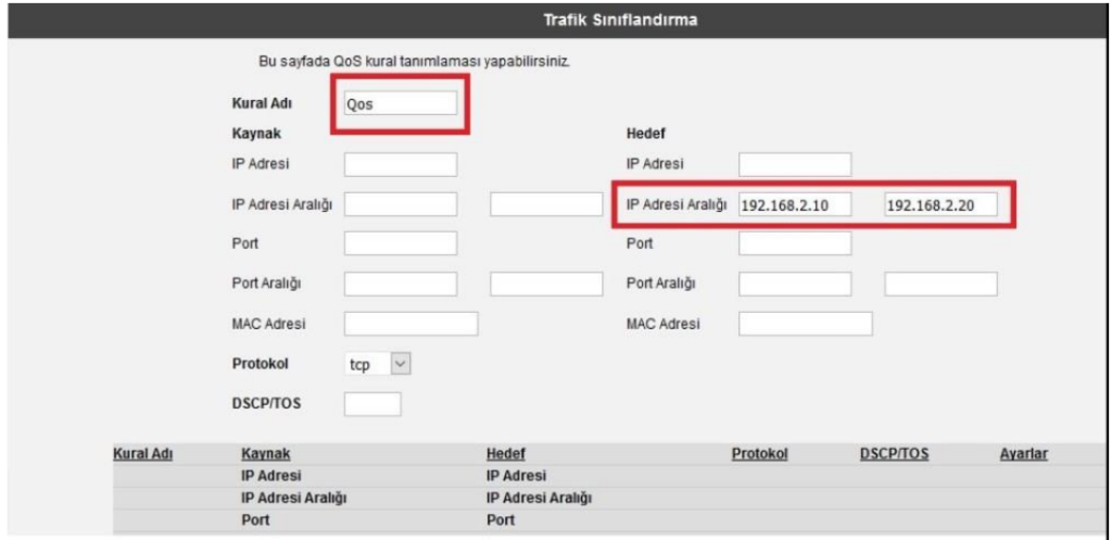 5. “Qos” menüsü altında açılan menülerden “Trafik Sınıflandırma” menüsüne tıklanarak “Kural Adı” kısmına herhangi bir isim verip, “Hedef” bölümündeki “İp Adresi Aralığı” kısmına ip bloğu aralığı belirleyerek kaydediyoruz.