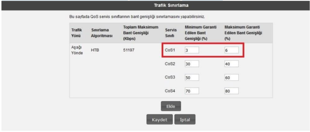 7. Son olarak Sol taraftaki “QOS ” ana menüsünün altında yer alan “ Trafik Sınırlama” başlıklı ekranı açınız. Açılan ayar sayfasında internet hızımızın yer aldığı Cos1 alanlarına Minimum Garanti Edilen Bant Genişliği (%) ve Maksimum Garanti Edilen Bant Genişliği (%) oranlarını belirleyip Kaydediyoruz.