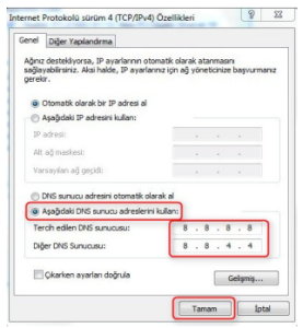 Diğer DNS sunucusu: 8.8.4.4 (Ya da farklı bir DNS adresi yazabilirsiniz.)