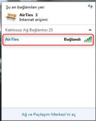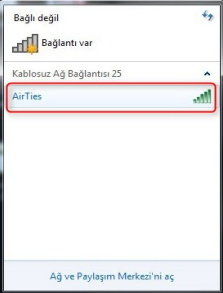 Windows 7 işletim sisteminde, kablosuz ayarları yapılandırılmış ve AirTouch özelliği bulunan modeminize, Air serisi bir kablosuz adaptör ile bağlanmak isterseniz, AirTouch tuşuna basarak bu işlemi gerçekleştirebilirsiniz. Aşağıda AirTouch kablosuz kurulumunu nasıl yapabileceğiniz konusunda bir örnek mevcuttur. Bağlanabileceğiniz kablosuz ağı görüntülemek için, masaüstünüzde sağ alt köşedeki ağ bağlantı simgesine tıklayabilirsiniz ya da sırasıyla aşağıdaki adımları takip edebilirsiniz.