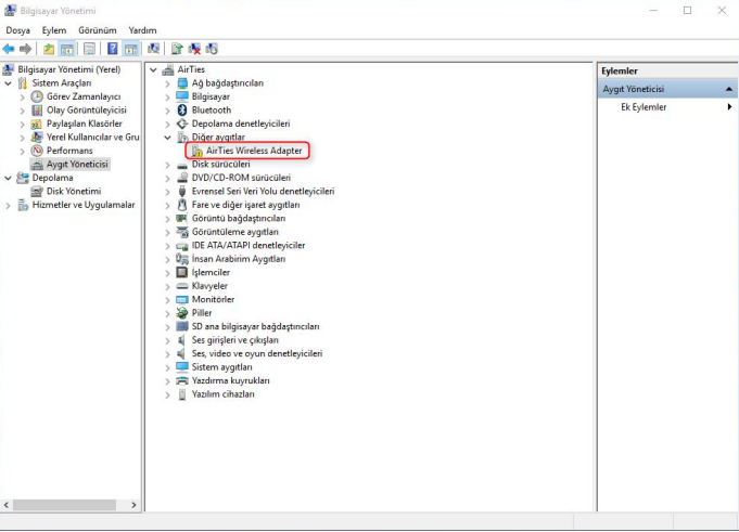 1. Cihazınızı bilgisayarınızın USB girişine taktıktan sonra, masaüstünüzdeki “Bilgisayarım” simgesine sağ tuş tıklayarak “Yönet” seçeneğine tıklayınız. Açılan “Bilgisayar Yönetimi” ekranından “Aygıt Yöneticisi” seçeneğine tıklayınız. Cihazınız bu ekranda “AirTies Wireless Adapter” veya sarı ünlem işaretli bir bağdaştırıcı simgesi olarak görünecektir.
