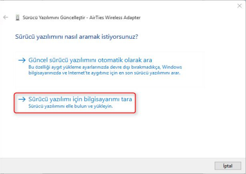 2. Bağdaştırıcı simgesine sağ tuşla tıklayarak “Sürücü Yazılımını Güncelleştir”seçeneğine tıklayınız. “Sürücü yazılımı için bilgisayarımı tara” seçeneğine tıklayınız.