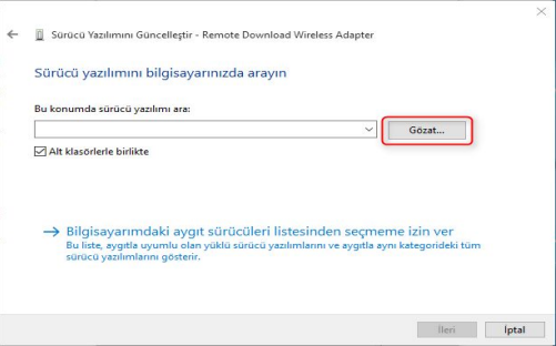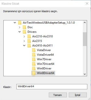 3. Ekrana gelen sayfada “Gözat” seçeneğine tıklayarak, AirTies Web sitesinden indirdiğiniz güncel sürücü (Driver) içindeki “Win8Driver” (Bilgisayarda kullanılan işletim sistemine bağlı olarak 64bit işletim sistemine sahip bilgisayarlarda, “Win8Driver64” klasörünü seçmeniz gerekmektedir.) klasörünü seçiniz. “İleri>” tuşunu tıklayıp devam ediniz.