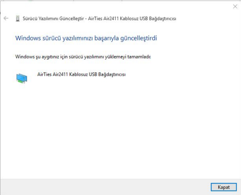 4. Karşınıza gelen “Windows sürücü yazılımınızı başarıyla güncelleştirdi”sayfasından “Kapat” seçeneğine tıklayarak çıkabilirsiniz.