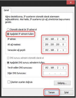 5. Açılan Internet iletişim kuralları(TCP/IP) veya Internet Protokolü sürüm 4(TCP/IPv4) penceresinde Aşağıdaki IP adresini kullan seçeneğini işaretleyiniz ve aşağısında açılan IP adresi alanına 192.168.2.50 IP adresi giriniz.