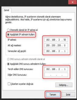 IP Adresi : 192.168.2.50 (192.168.2.20 – 192.168.2.254 aralığından bir IP belirleyebilirsiniz.)