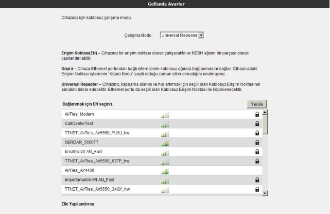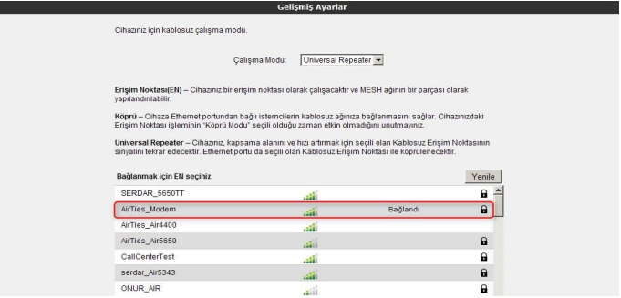 Not: Cihazınızı universal repeater olarak kullanabilmek için yüklü olan yazılım versiyonunun universal repeater desteklediğine emin olunuz. Yazılım versiyonları için lütfen AirTies/YüklemeMerkezi’nde cihazınızın Firmware bölümünü ziyaret ediniz.
