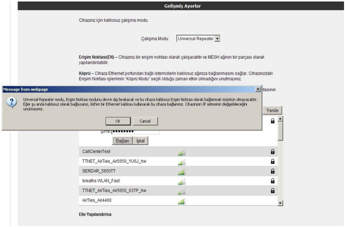 UYARI: Universal repeater modunda çalışan cihazında kablosuz ismi ve şifreyi değiştiremezsiniz. Bu şekilde cihazınız sadece modemin sahip olduğu kablosuz ağ ismi ve şifresi ile yayın yapacaktır.
