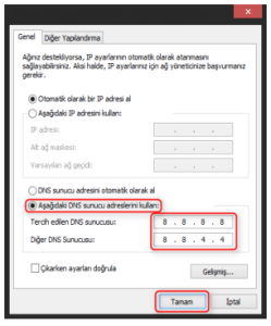 Diğer DNS sunucusu: . . . . (Diğer DNS kısmını boş bırakabilir ya da farklı bir DNS adresi yazabilirsiniz.)