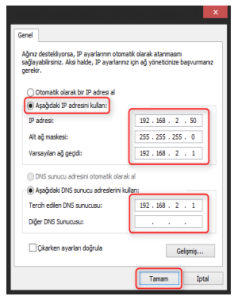 IP Adresi : 192.168.2.50 (192.168.2.20 192.168.2.254 aralığından bir IP belirleyebilirsiniz.)