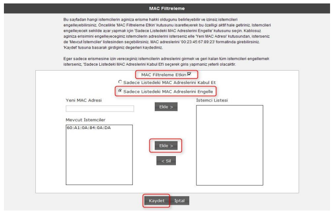 MAC Adresi Filtrelemeyi etkin hale getirip belirlenen kullanıcıları engelleyecek şekilde gerekli ayarları yapmak için: