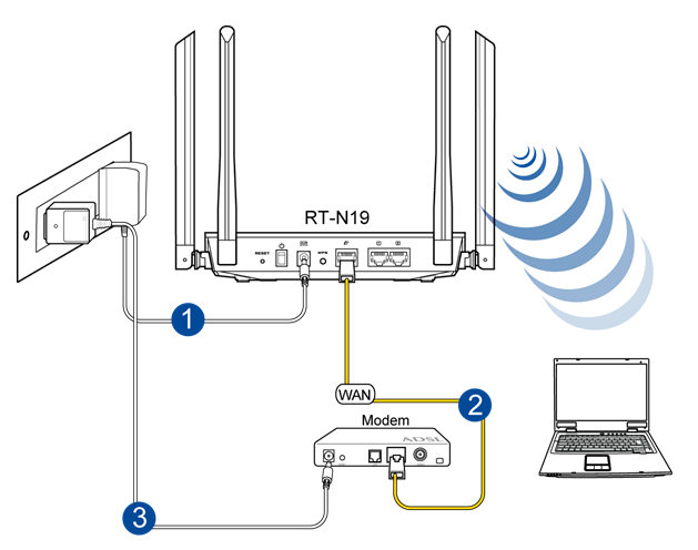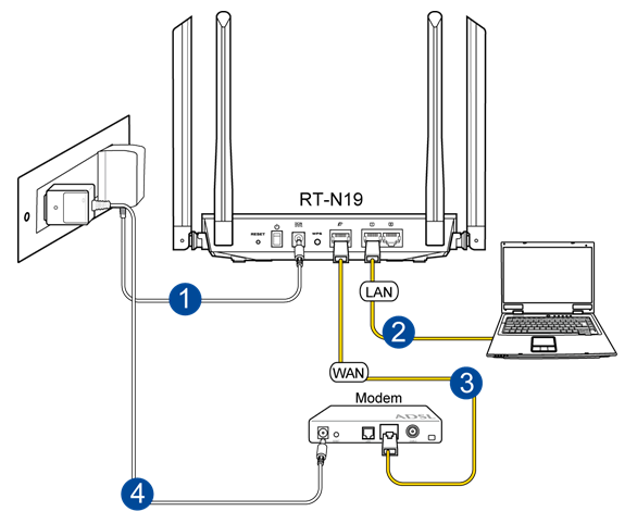 - Using the bundled network cable, connect your modem to your wireless router’s WAN port.