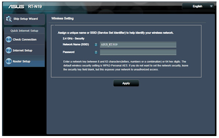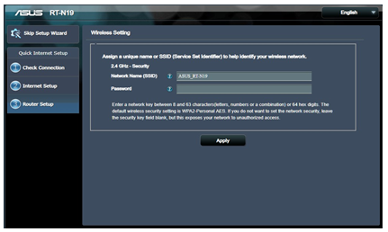 3. Assign the wireless network name (SSID) and security key for your 2.4GHz wireless connection. Click Apply when done.
