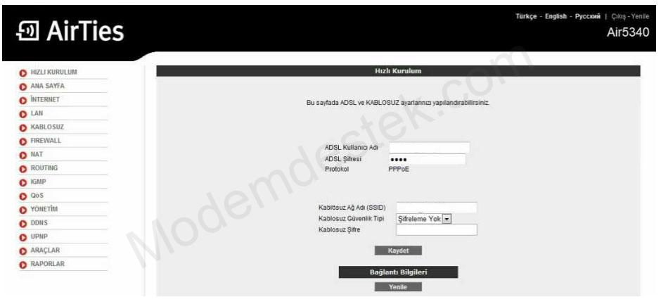 Modem ayarlarınızı ilk defa yapıyorsanız karşınıza hızlı kurulum sayfası gelecektir. Dilerseniz daha sonraki kurulum işlemleriniz için de sol menüdeki “HIZLI KURULUM” menüsünü kullanabilirsiniz.
