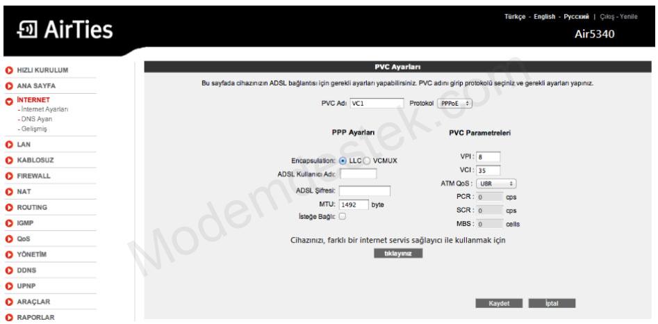 PVC ayarları; VPI:8, VCI:35, Encapsulation:LLC bilgilerini istenilen bölümlere yazınız.