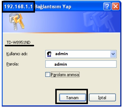 - ‘Kullanıcı adı’ ve ‘Parola’ kutucuklarına küçük harflerle ‘admin’ yazdıktan sonra ‘Tamam’ butonuna tıklıyoruz.