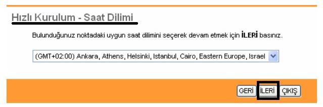 ‘Hızlı Başlat-Saat Dilimi’ sayfasında ‘GMT+02:00 Ankara, Athens, Helsinki, İstanbul’ seçeneğini seçtikten sonra ‘İLERİ’ butonuna tıklıyoruz.
