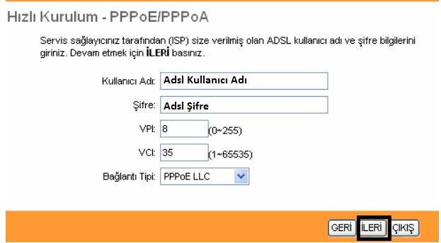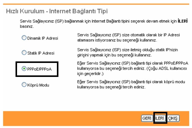 - ‘Hızlı Başlat-ISP bağlantı Türü’ sayfasında, ‘PPPoE/PPPoA’ seçeneğini seçtikten sonra ‘İLERİ’ butonuna tıklıyoruz.
