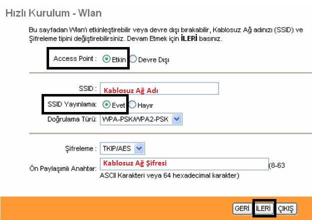 - ‘Hızlı Kurulum – Wlan’ sayfasında modeminizin kablosuz ağ ayarlarını aşağıdaki gibi düzenliyoruz.