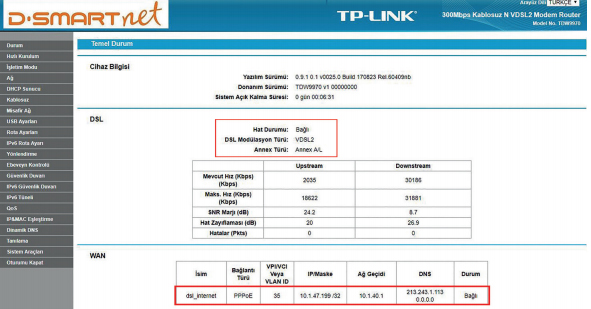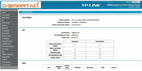 – Karşınıza durum sayfası gelecektir. Bu sayfadan DSL ve WAN Tablolarını