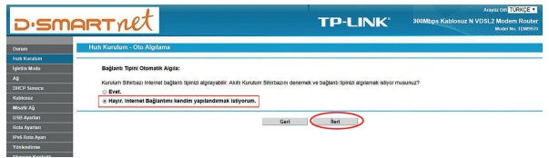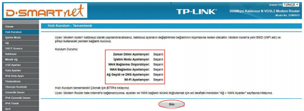 -Hızlı Kurulum işlemleri tamamlanmıştır. İnternete bağlanmayı deneyebilirsiniz.