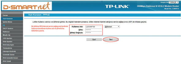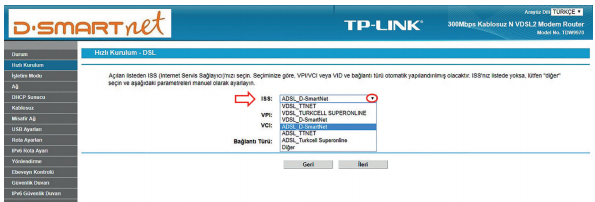 – İnternet Servis Sağlayıcı profilinin seçimini yaptıktan sonra (VDSL/