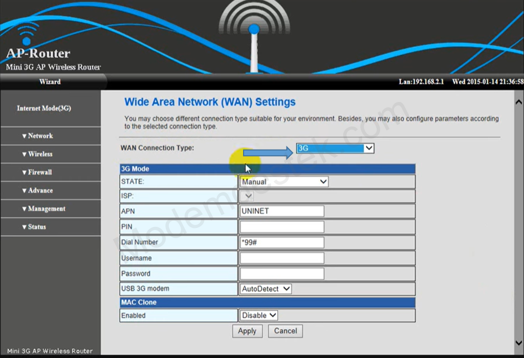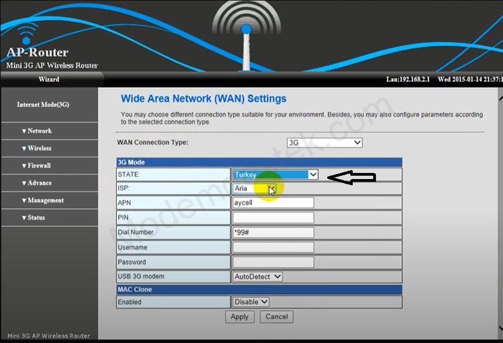 Ekrana gelen menüden WAN Connection Type yazan kısmı 3G olarak seçiniz.
