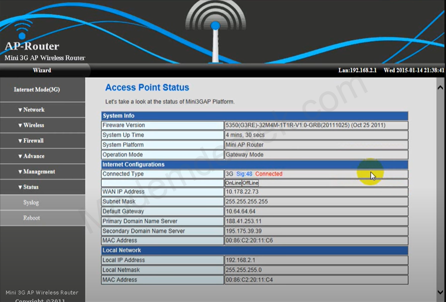 Router 3G cihazın kurulumunun yapılıp yapılmadığını öğrenmek için; sol kısımda yer alan Status butonuna tıklayınız.