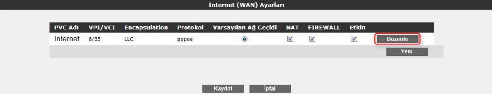 -İnternet ayarlarına girebilmek için tablo üzerindeki “Düzenle” tuşuna tıklayınız. Karşınıza İnternet ayarlarını