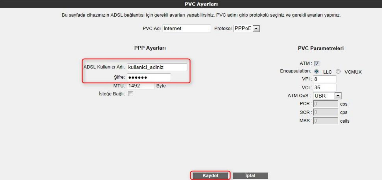 -PVC ayarları ekranında Internet sağlayıcınızın size vermiş olduğu “ADSL kullanıcı adı” ve “şifrenizi” ilgili