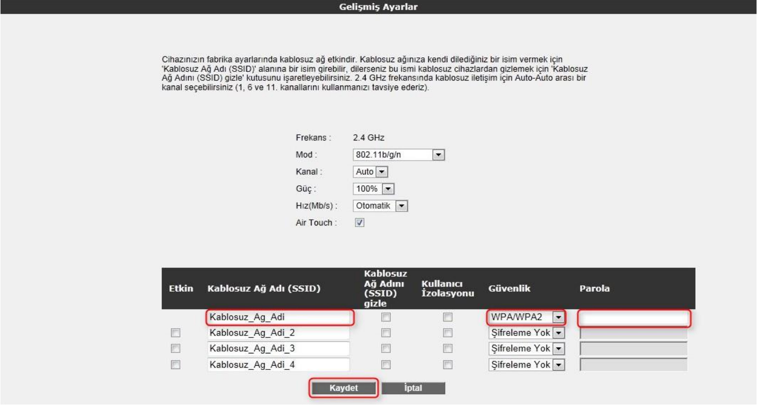 -Güvenlik seçeneğinden WPA/WPA2’yi seçiniz. “Parola” alanına Türkçe karakter (ç,ö,ü,ı,ğ,ş) ve boşluk