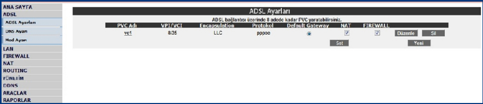 -Karşınıza gelen ekranın sol – üst tarafındaki menüden “ADSL” menüsüne ve altındaki