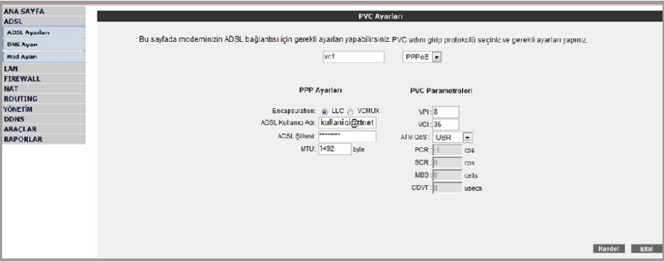 vermiş olduğu ADSL kullanıcı adınızı ve şifrenizi girip “Kaydet” düğmesine basınız.