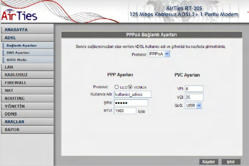 PVC ayarları alanında VPI değeri olarak 8, VCI değeri olarak da 35 girilmiş haldedir
