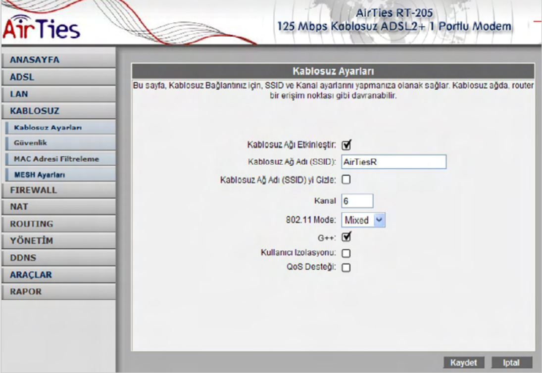 RT-205’in Kablosuz menüsü altında kablosuz iletişim ayarları ve kablosuz güvenlik ayarları