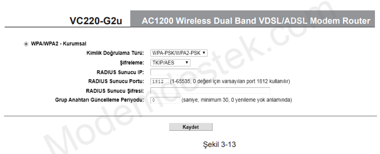 WPA/WPA2 – Kurumsal: bu yöntemede modem kablosuz bağlantı yapmak için