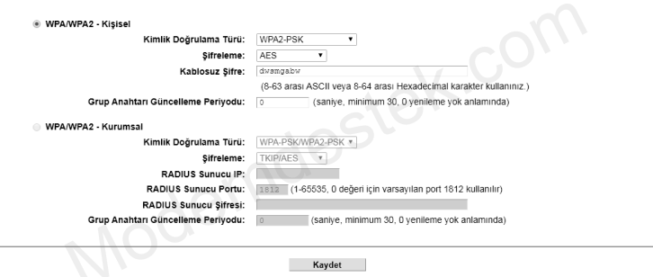 • Kimlik Doğrulama Türü: Aşağı açılan listeden WPA/WPA2-Kişisel güvenlik