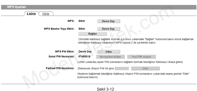 işlevini devre dışı bırakmak için “Kablosuz Ayarları” -> ”WPS Ayarları” menüsünü