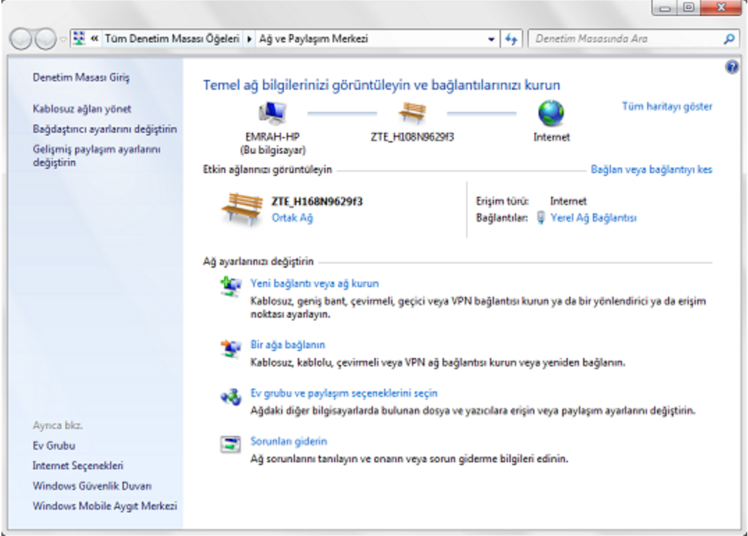 Açılan seçeneklerden Ağ ve Paylaşım Merkezi’ni Aç seçeneğini tıklayın ve Ağ paylaşım ekranı görüntülenir.