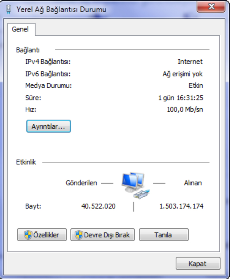 Yukarıdaki ekranda Yerel Ağ Bağlantısı linkine tıklayarak bağlantı durum penceresini açın ve Ayrıntılar butonuna tıklayarak IP adres bilgilerinin doğruluğunu kontrol edin. Ağ kartınıza elle IP adresi vermek veya Elle verilmiş IP ayarını otomatik IP almaya çevirmek için Özelliklerbutonuna tıklayarak İnternet Protokolü sürüm 4 (TCP/IPv4) seçeneğine tıklayarak pencereyi açın.