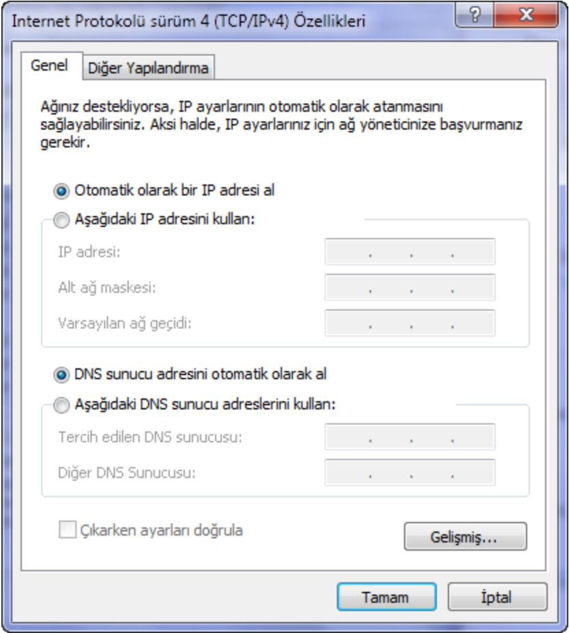 Ağ kartınızın modemden otomatik IP adresi alması için ayarlar gösterildiği gibi seçin ve Tamam butonu ile kaydederek çıkın.