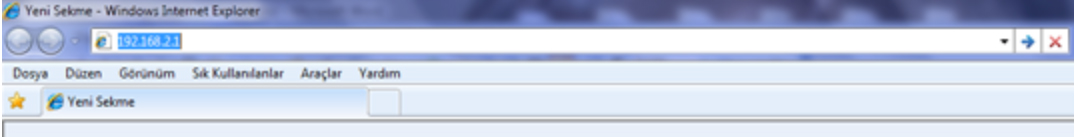 -Modeminizin WEB ara yüzünde girmek için öncelikle modem ile tüm kablo bağlantılarınızın doğru şekilde yapıldığından ve modeminizin çalıştığından emin olun, daha sonra bilgisayarınızda bir Internet Explorer penceresi açın ve adres alanına 192.168.2.1 (modemin IP adresi) girerek enter tuşuna basın.