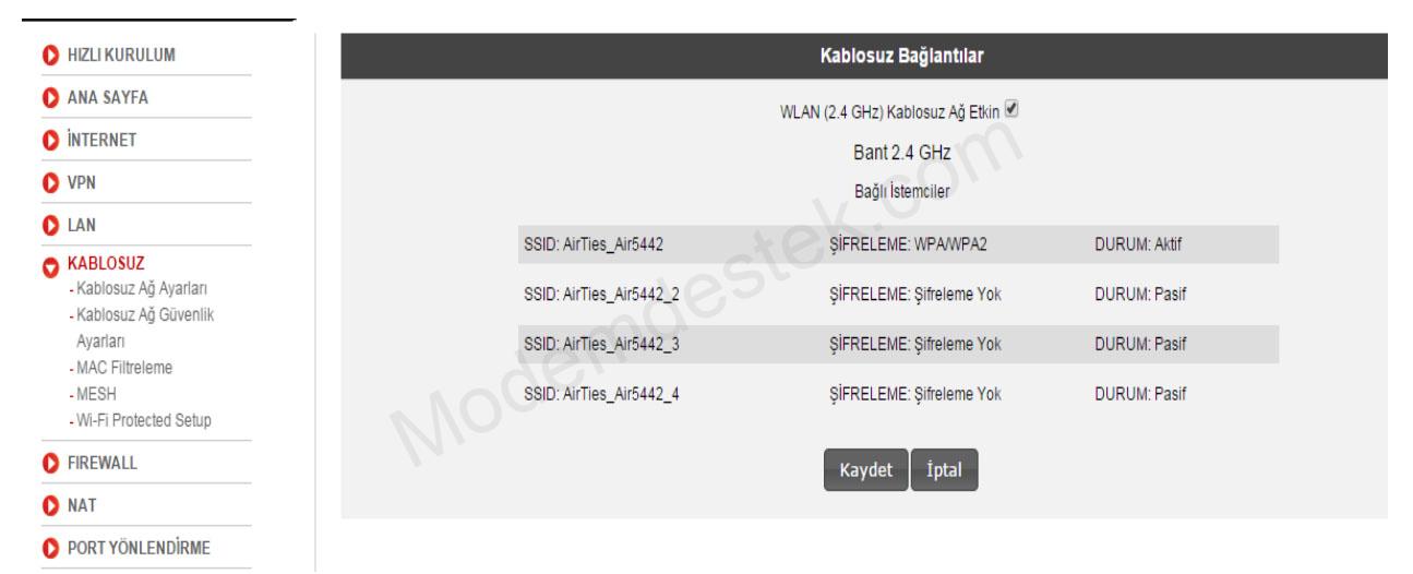 – WLAN (2.4 GHz) Kablosuz Ağ Etkin yanında yer alan kutucuk işaretlenerek Kaydet butonuna basılır.