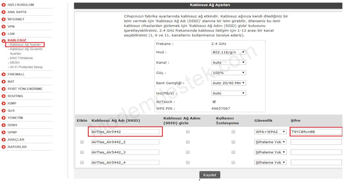 – Kablosuz ayarları için ekranın sol bölümünde yer alan KABLOSUZ menüsü altındaki Kablosuz Ağ Ayarları’na tıklanır. Bu ekran da kablosuz ağ adı ve şifresi yazılarak Kaydet butonuna basılır