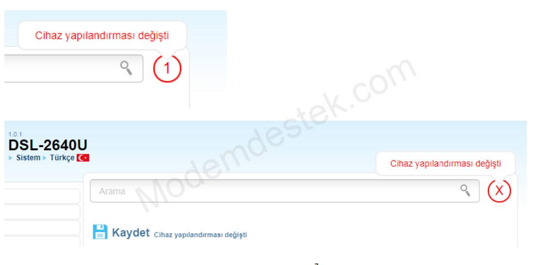 Modem üzerinde bir işlem uygulandığında ekranın sağ üst kösesinde Cihaz yapılandırması değişti uyarısı alınmaktadır. Yapılan işlemlerin kaydedilmesi için önce bu ekrana daha sonra açılan Kaydet butonuna tıklanarak işlem tamamlanır